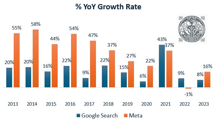 However, given the large share of digital media already, it’s also clear that growth will continue to slow down. This can easily be seen in the annual growth rates of both Google Search and Meta, which have gradually been trending down over time — with the exception of the online boom during the covid lockdowns..