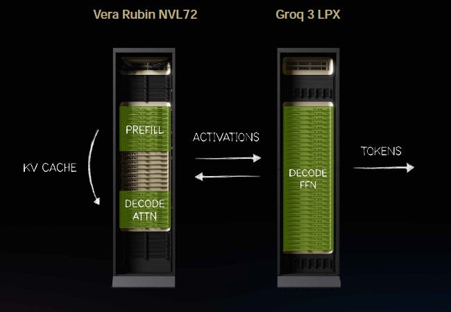 It would take a lot of Groq chips to be able to hold the parameter size of Rubin as well as all of the KV Cache that has to go along with it. So that limited Groq’s ability to really reach the mainstream and take off, until we had a great idea. What if we disaggregated inference altogether with a piece of software called Dynamo so that we could put the work that makes sense on Vera Rubin and then offload the low latency, decode generation part of the workload on Groq. And so we unified processors of extreme differences, one for high throughput and one for low latency.