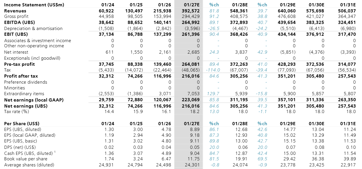 The golden question is how AI demand will come in over that fiscal ‘29-’31 period for Nvidia, as we already know that this year (FY27) and also next year (FY28) will come in strong. However, the market is assuming we’re now heading close to a peak in terms of AI capex spend which we can also see in UBS’ numbers: