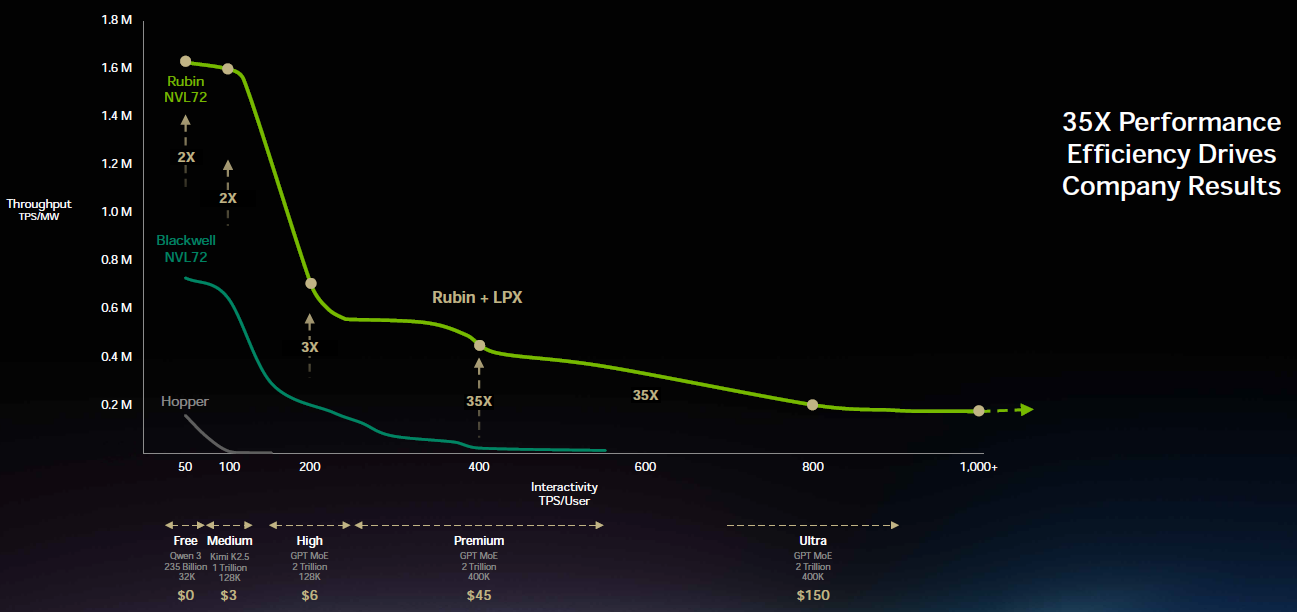 “So we acquired the team that worked on the Groq chips and licensed the technology, and we’ve been working together now to integrate the system. At the most valuable tier, we’re now going to increase performance by 35x. I would add Groq to maybe 25% of my total data center, and the rest of my data center is all Vera Rubin.