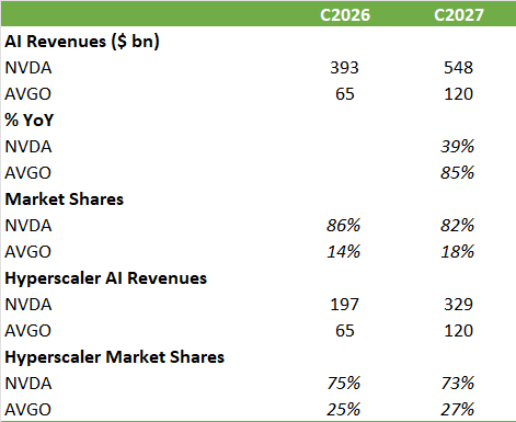 Based on these numbers we can do some modeling. We know that Nvidia makes around 50-60% of their revenues from hyperscalers, so if we then compare these revenues to Broadcom’s AI revenues, we know that Broadcom will grow its market share at the hyperscalers to around 27% by next year:
