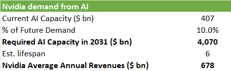 As a thought exercise, we tried to estimate Nvidia’s future annual revenues based on where AI demand will go five-six years from now in 2031. We start from current AI capacity, which is basically the sum of Nvidia’s revenues over the last three years. So, this should be roughly the current installed base excluding Google’s TPU-based data centers. This results in $407 billion of current AI capacity.
