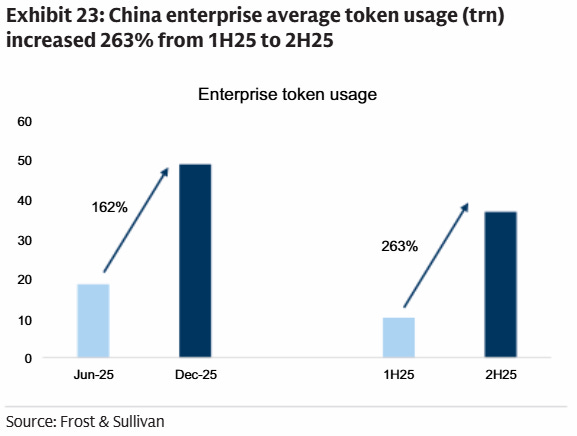 On all metrics, token consumption is exploding. According to OpenAI’s recent enterprise report, API token consumption for reasoning increased 320-fold year-over-year. In the meanwhile, the current shift to AI agents—which communicate with each other over multiple steps—is again compounding reasoning volumes. Goldman notes that China enterprise token usage grew 162% from June to December, while China is even more short on compute than the West: