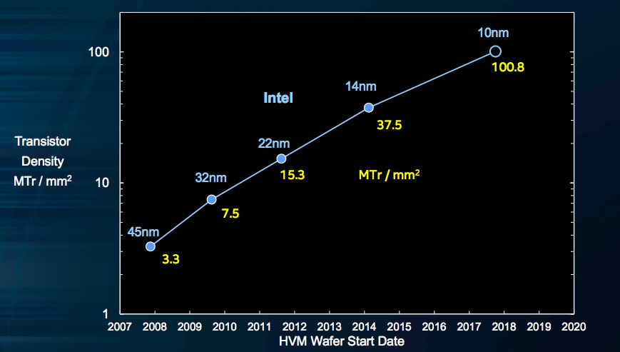 A better measure of Moore’s law is whether the number of transistors within a given chip area is still doubling every two years, and here the curve started already to show a clear logarithmic pattern during the previous decade: