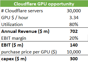 Having a GPU in 30,000 servers could bring in $702 million in annual revenues and $140 million in EBIT, which would nearly double Cloudflare’s estimated EBIT for this calendar year. So AI on the edge can become a meaningful business for Cloudflare over time and it’s certainly an interesting story to keep an eye on.