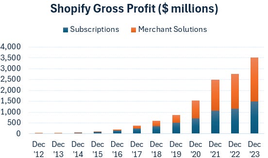 Shopify has two revenue streams, software subscriptions where customers can run their e-commerce operations from and merchant solutions which is mostly payments processing: