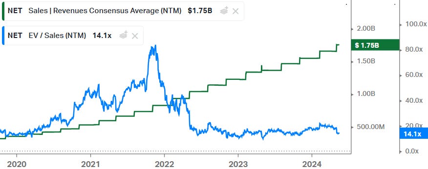 The market has gotten smarter since then and you can’t buy a name like this anymore on 8x forward Sales. In fact, the cheapest Cloudflare has ever traded is just below 11x: