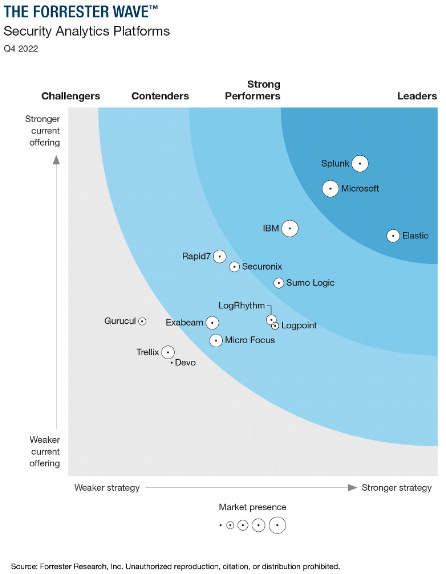 Forrester already sees Elastic as a leader in security analytics, rating them number one in terms of strategy (horizontal axis) although still lagging Splunk and Microsoft in terms of offering.