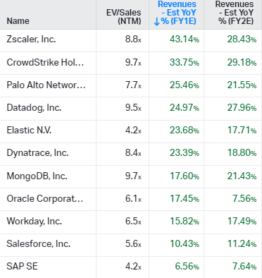 Elastic is currently trading on 4.2x NTM Sales. This looks cheap compared to the company’s peer group of high growth SaaS companies active in data, security, and observability. Elastic is also cheaper than more mature software companies who exhibit lower growth rates. Albeit, you can make the argument that SAP and Workday are much stickier businesses, as its very hard to replace these when the core of your business is running on these platforms.
