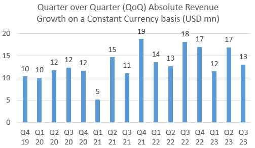 Below I calculated the absolute growth in sequential quarterly revenues while adjusting it for currency impact (using the data in the chart above). You can see that the company has been adding on average $15 million to quarterly revenues each quarter over the last ten.