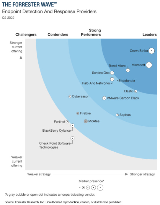 The leaders in this field are CrowdStrike and Microsoft. Forrester rates Elastic as a strong performer and number three in terms of strategy. Over time they should be able to expand their offering and move up the vertical axis.