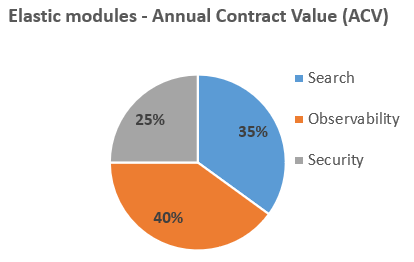 Looking at Elastic’s annualized contract values (ACV) split by business, despite their more recent launches, observability and security are already large contributors. Currently security is showing the fastest growth rates. As observability is a larger market than search, it already has become the largest contributor to Elastic’s revenues at 40%.