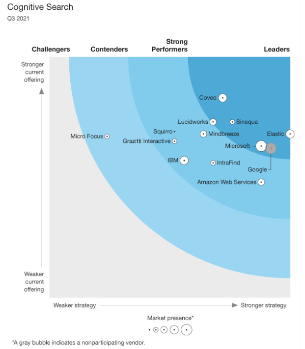 Elastic is a leader in the enterprise search market. Forrester sees as key competitors Coveo, smaller player Sinequa, Microsoft, Google and Lucidworks. However, the hyperscalers such as Microsoft, Google and Amazon, are much less of a threat because their products are used to analyze data within their cloud environments.