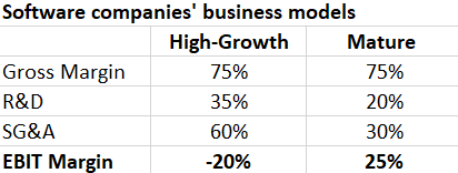 This is why comparing software companies on an EV-to-Sales basis is useful. The key is picking the good ones which can transform over time into the quality, mature businesses generating solid EBIT margins.