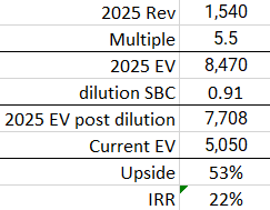 Bringing it all together, with the strength of the new businesses and Elastic’s ability to expand revenues at existing customers, this should become a $1.5 to $2 billion business in the medium term. If I model in my revenue forecast of $1.54 billion for 2025, add some modest re-rating to an EV-to-Sales of 5.5x as the near term macro headwinds blow over, while factoring a 5% dilution per annum from SBC (in line with history and company guidance), this brings me to an IRR of 22%.