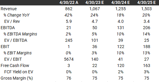 Consensus improvements in EBIT margins are roughly in line with the company’s guidance of 4 to 5 percentage points per year. Due to the mix shift to the cloud, as 90% of new customers are landing on the cloud, they mentioned that over time they can improve both gross and EBIT margins. Some of Elastic’s peers have considerably higher gross margins e.g. Datadog (79%), Dynatrace (82%) and Zscaler (78%) so there’s certainly room for upside.