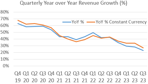 Elastic has been generating consistently high organic revenue growth rates. Percentage growth rates have been moderating over time which is logical due to the law of large numbers.