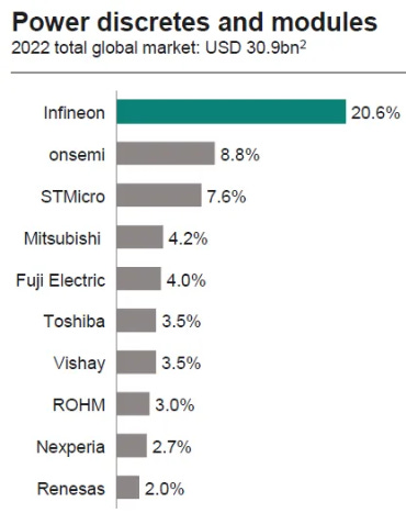 Infineon is currently the leader in this market, mainly thanks to its strong position in high-power and silicon-based IGBTs. However, as the silicon-based market transitions to the novel materials discussed above, we have a set of new competitors emerging such as Navitas which currently leads in GaN.