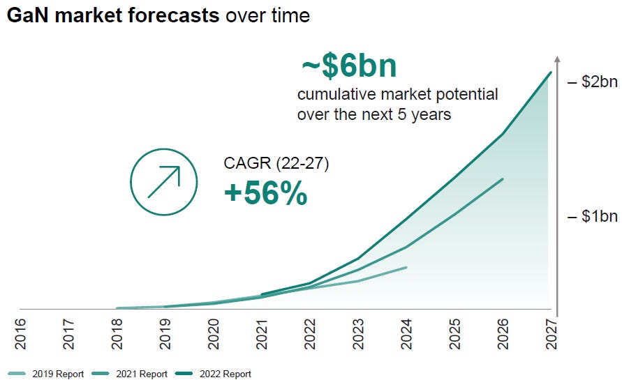 Due to GaN’s ever increasing number of applications, projections for the size of the market have continuously been revised upward over the past years:
