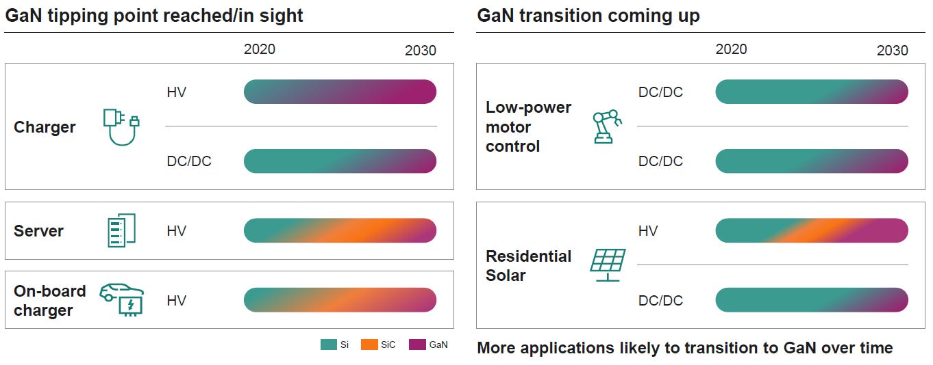 Due to these advantages, power semiconductor giant Infineon sees several end-markets which are currently transitioning to SiC, subsequently making the move to GaN by the end of the decade. These include servers, onboard EV chargers and high-voltage residential solar, while other markets are transitioning from silicon to GaN directly: