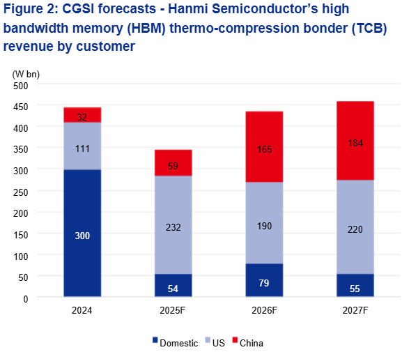“As China pushes for advanced chip localization, centered on Huawei, we expect Chinese outsourced semiconductor assembly and test players (OSAT) to place large-volume orders for critical packaging process tools to Hanmi and key Japanese players, driven by Huawei’s production ramp-up for artificial intelligence (AI) chips amid the depletion of pre-secured HBMs. We expect Chinese HBM players to start mass volume shipment in 2H26F and project their monthly HBM through silicon via (TSV) capacity at 60k by end-2026F and 127k by end-2027F. Assuming 50% thermo-compression bonder (TCB) market share of Hanmi in China, we expect its China-bound bonder exports to jump to W164.6bn in FY26F and W183.9bn in FY27F from W58.9bn in FY25F, contributing 38% and 40% in total TCB sales in FY26F and FY27F, respectively, up from 17% in FY25F.”