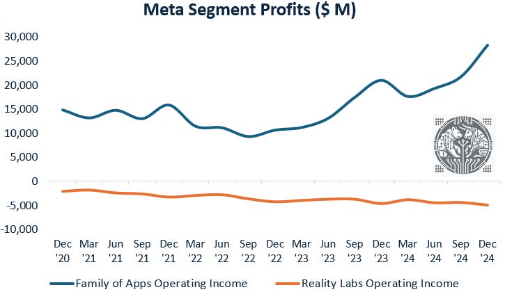 However, we can see that post the 2022 trough, Meta’s family of apps saw spectacular profit growth. The share price reaction was the same, with the shares going up 7-fold since the market completely misread this situation in late ‘22.