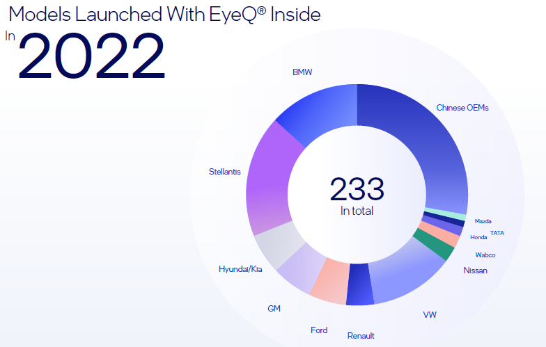 Mobileye has access to large amounts of mapping data as it launched this REM product in 2018, with EyeQ chips collecting data from their surroundings. In 2022 alone, these EyeQ chips were integrated in 233 model launches from a large variety of OEMs, as part of a base ADAS system: