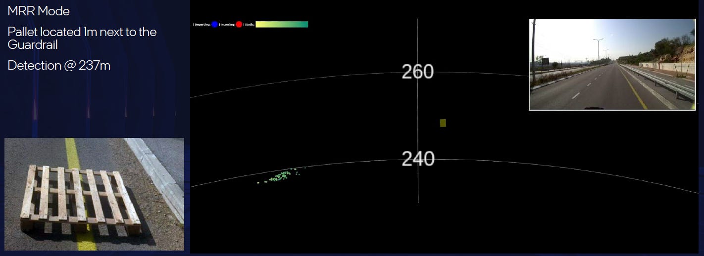 Another obvious use case of lidar is for long range detection, with in the below example a pallet being detected on the highway at 237 meters from the vehicle. So already the vehicle can start to prepare to switch lanes: