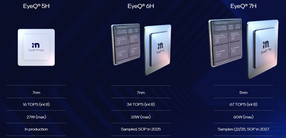 For its next generation autopilots, Mobileye has developed a hands-off system called SuperVision, an eyes-off system called Chauffeur, and a robotaxi system called Drive. These systems can make use of surround cameras, radars and one front lidar: