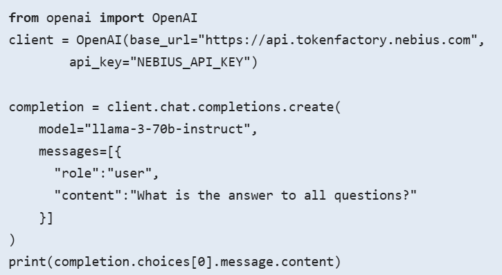 Most enterprises take up as much capacity as they can in the major clouds as it allows them to run their GPU VMs alongside where their data is stored. It’s very expensive and time-consuming to move large amounts of data out of these clouds due to high egress fees and bandwidth constraints. This is why winning contracts with the big clouds presents so much upside to the neoclouds, as neoclouds are only gradually winning their own customers. So, most of neocloud revenues are currently coming from hyperscalers where end customers are not even aware that their GPU workloads are being offloaded onto neoclouds. For example, customers connect to Azure over API and these requests are then sent to CoreWeave data centers as Microsoft is short on GPU capacity. This piece of code below shows what an API call looks like: