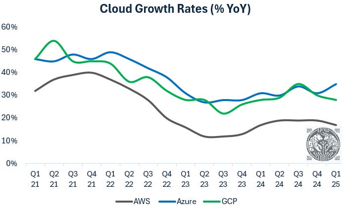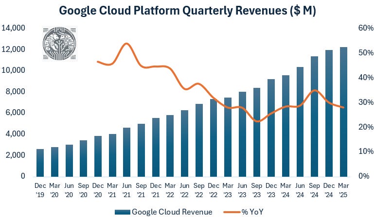 The three big public clouds were already amongst the best businesses in the world, and AI has again accelerated growth rates. For Google’s cloud platform, growth rates stepped up again towards the 30% range as from March last year:
