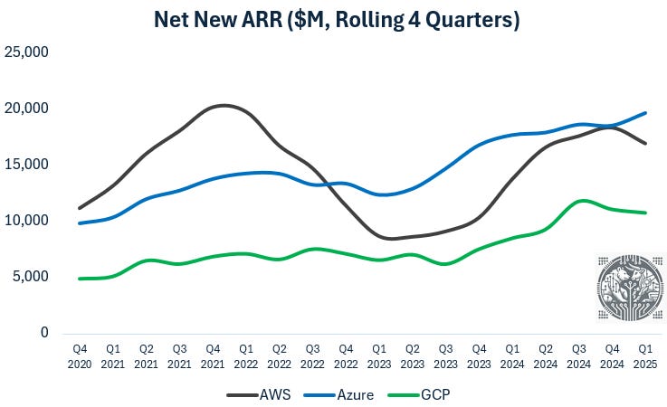 Microsoft has been a beast in the cloud—you can see clearly how they’ve strongly outperformed Amazon Web Services (AWS) over the last two years, adding much more annually recurring net new revenues to their business: