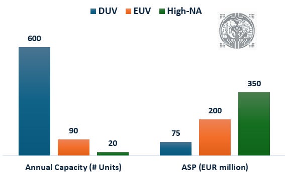 The below chart illustrates ASML’s near term manufacturing capacity per tool, and the ASPs: