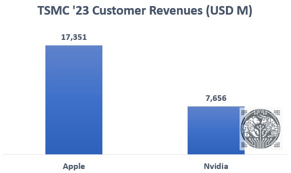 Remember also that these designers have decades long relationships with TSMC, who has always delivered, while Intel has been stumbling and on top of that remains a competitor. TSMC’s goals on the other hand are fully aligned with their customers, whereas Intel’s goals ultimately are to disrupt their customers’ strongholds, i.e. Nvidia in datacenter GPUs, AMD in datacenter CPUs, and Broadcom in datacenter networking. Therefore, the most likely customers who could potentially make the shift to Intel at some stage are the hyperscalers with their custom silicon, such as Google, Amazon, Microsoft and Meta, and also smartphone giant Apple, which remains TSMC’s largest customer contributing around 23% to revenues: