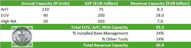 Assuming a revenue contribution of 24% from installed base management, and 14% from the company’s various other tools, this leads ASML already to have a EUR 51 billion annual revenue capacity near term: