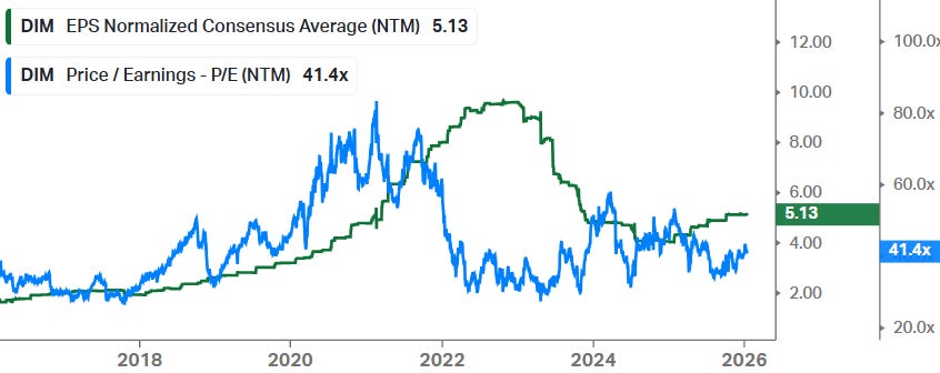 Sartorius Stedim (DIM.FR) is a good quality player in this space, and the downturn post covid is well illustrated in its forecasted EPS chart below. Forecasted EPS have now started to gradually recover and with improved order flow commentary. So, it looks like we’re past the trough now and can start moving into a new upcycle in the coming years: