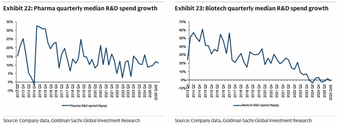 However, post the covid lifesciences boom, biotech R&D went into a cyclical downturn with growth rates coming to a halt (chart on the right):