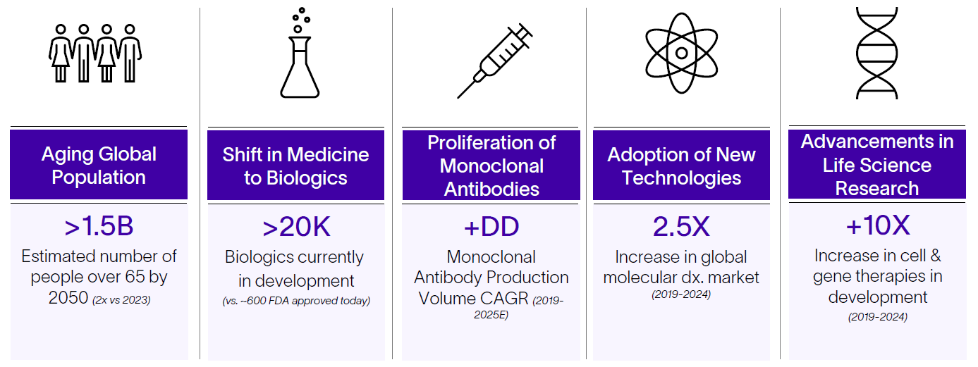 We continue to like picks and shovels plays for the biotech industry. Let’s look at some thematic drivers. First, an aging population in developed markets will drive an increased demand for medical treatments. Secondly, we’re shifting from simple molecules—which were cheap and easy to manufacture—into biologics and new tech such as cell and gene therapies which require more specialized supply chains, manufacturing and R&D. Third, the medical field is extremely data intensive which makes it perfect for AI to boost innovation, for example in medical diagnosis, personalized medicine, and drug design.