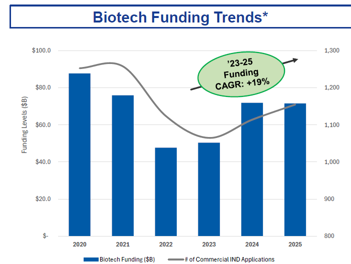 70% of our business is commercial business although clinical and early-stage biotechs work is important for us to have this pull-through and learn about what’s going to be needed in the future. It’s a business that we want to do and nurture, but it’s not a big growth driver for us upwards or downwards depending on how the biotech industry goes. Usually, when you see an uptake in funding, this takes 2 to 3 quarters to actually materialize. Why? Because companies need to review their development plans, issue RFPs, and then CDMOs have to come back. So this takes time. And the earlier the phase, the smaller these amounts are. There’s a lot of redevelopment work and batch manufacturing that is involved in this. But, it’s usually a healthy sign for the industry.”