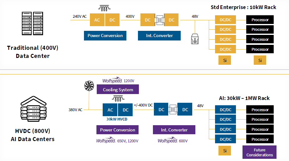 Wolfspeed illustrates that power semis are also used in cooling, as well as to convert power from the grid so that a single GPU can work at a lower voltage level. This will mainly be done by SiC (silicon carbide) whereas GaN (gallium nitride) is more heavily used at the rack level.