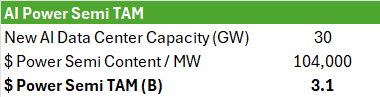 If 30GW of AI compute will be added per annum, this means a power semi TAM of around $3.1 billion from AI compute alone: