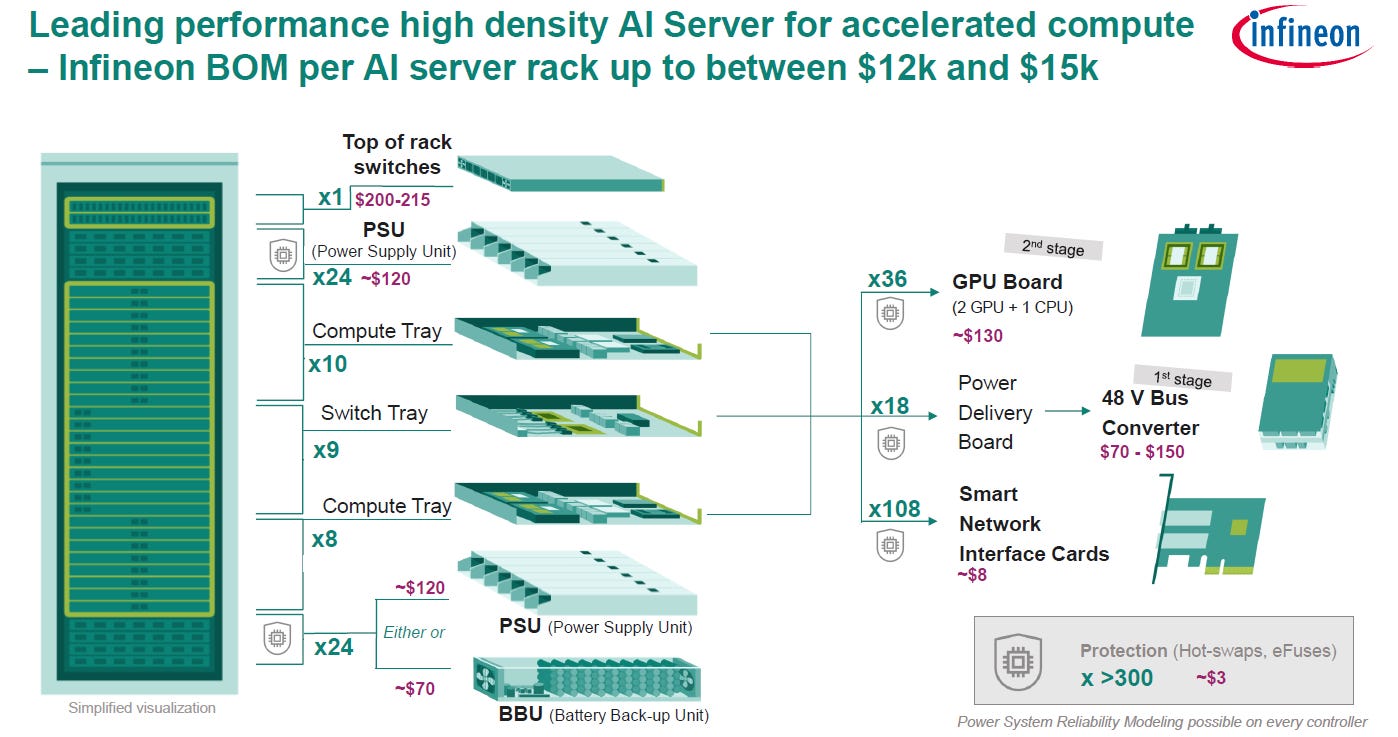 Infineon is another key player in power semis and guides for $12k–$15k of content for a current 130kW AI rack. Taking the midpoint, $13.5k of power semi content per 130kW rack means $104 per kW, or $104,000 per MW.
