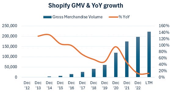 Shopify has been a very appealing, high-growth story. Although growth has now been somewhat maturing post the covid e-commerce boom. That said, GMV growth is still above 10% which remains attractive. On top of that, the company has additional growth levers such as novel software modules which can be monetized, price increases, additional financial services, and increasing the amount of payments processing.