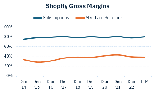 Shopify’s software subscriptions are generating gross margins of around 80%, whereas merchant solutions is currently at 38%: