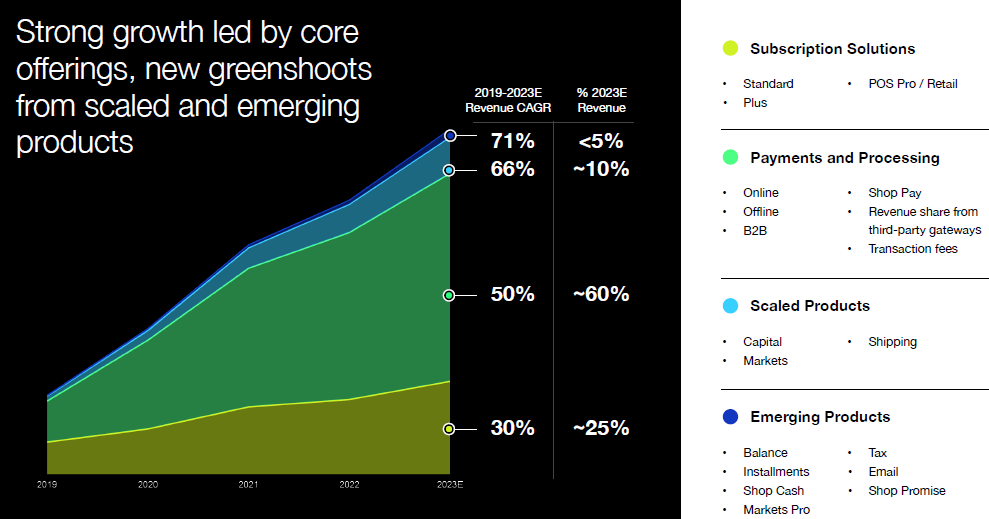In the meanwhile, payments processing has become the largest source of revenues and the company has developed its own Shop Pay checkout button here to compete with the likes of Paypal. The below slide gives an overview of Shopify’s various revenue streams. For example, large companies pay a higher software subscription fee (the Plus solution) and the company is also working on emerging products such as providing their merchants with financing.