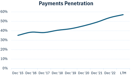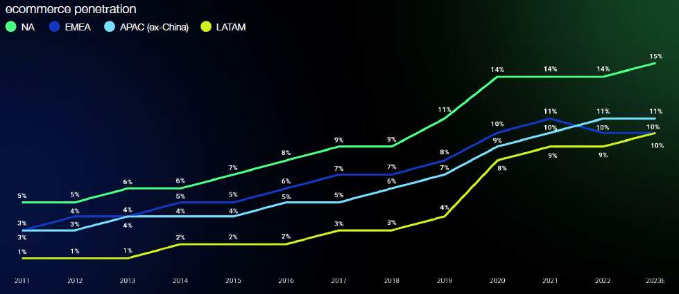 Another runway for growth is e-commerce’s still modest penetrations in the overall retail market: