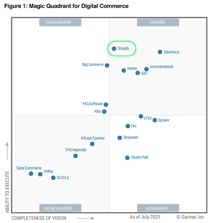 Also Gartner has selected Shopify as a leader (chart below). Both Salesforce and Adobe entered this field by acquisition, Salesforce acquired Demandware in 2016 and Adobe made the acquisition of Magento in 2018. Both of these names are oriented towards the enterprise market whereas Shopify’s bread-and-butter are SMBs.