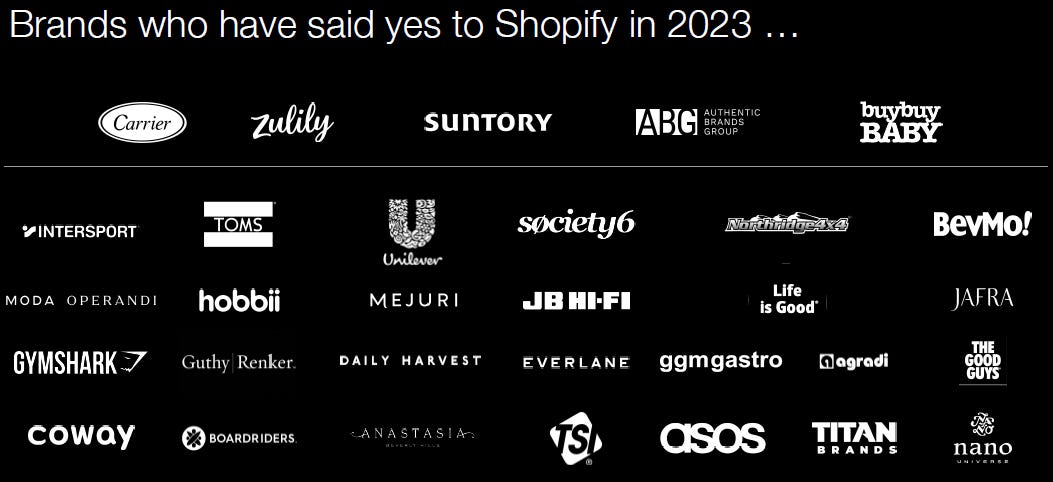 “In ‘22, we went out and got Accenture and Deloitte. In ‘23, we’ve been working very hard to bring all these other strategic partners on board. Now here’s a datapoint none of you have heard before: $20 billion in GMV is in pipe right now from the partners that you see listed on this board. Three things are pretty clear that enterprise customers tell us over and over again, we win because of the best TCO (total cost of ownership), we win because we have the best converting platform on the planet (turning shopping baskets into a paid checkout), and we win because we future proof them with our speed of innovation.”