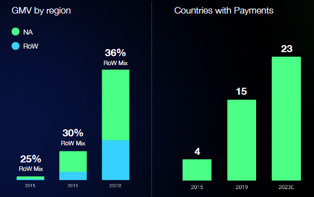 Historically Shopify has been heavily focused on North-America and this region still contributes more than 60% of GMV today. However, the rest-of-world has gradually been expanding in the mix: