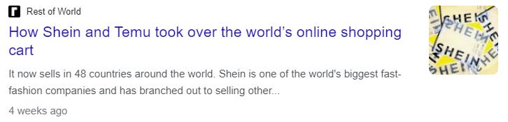 Temu doesn’t only sell fast-fashion, but a wide variety of categories, from Barron’s: “PDD’s overseas platform Temu — which became the most-downloaded app in the US and much of Western Europe after it was rolled out in September 2022 — has eaten into sales for Amazon and Shein, the latter of which it surpassed in sales revenue in May. PDD’s rapid rise is due in large part to its innovation in two key areas, said Doug Young, director of Hong Kong-based Bamboo Works, which analyzes Chinese companies listed in Hong Kong and abroad. The first is pricing, which Pinduoduo has kept low by working more directly with sellers, who are often actual manufacturers, giving the company much stronger pricing power, Young said. By comparison, Alibaba often works with merchants who aren’t actual manufacturers. The second is the social element, which ‘PDD has excelled at by getting people involved in group buying, and getting their friends and family members and anyone else they know to buy things,’ he said.”